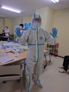 中京病院のスタッフの丁寧な指導のもと、正しい順序で着脱を実践しました。